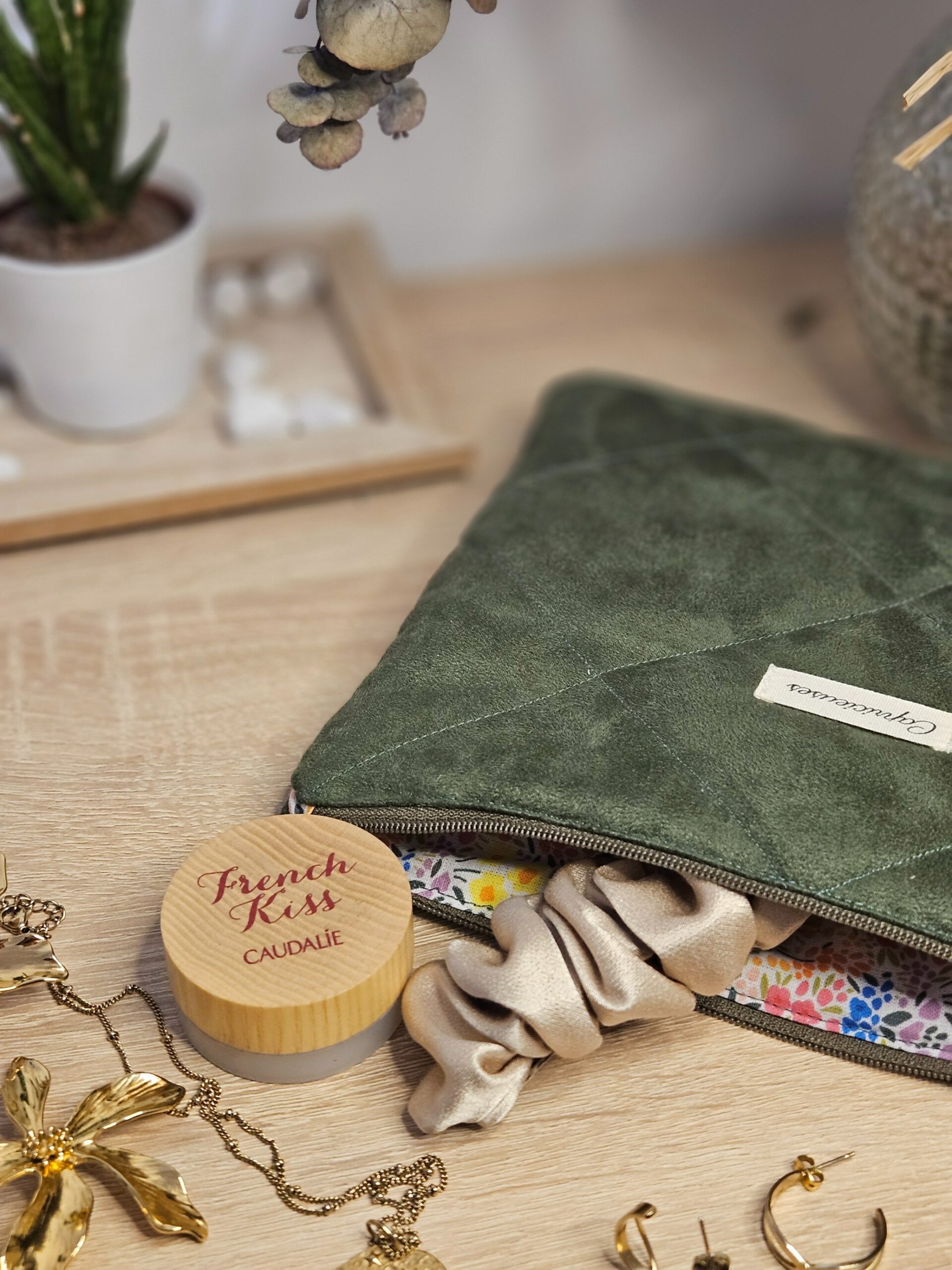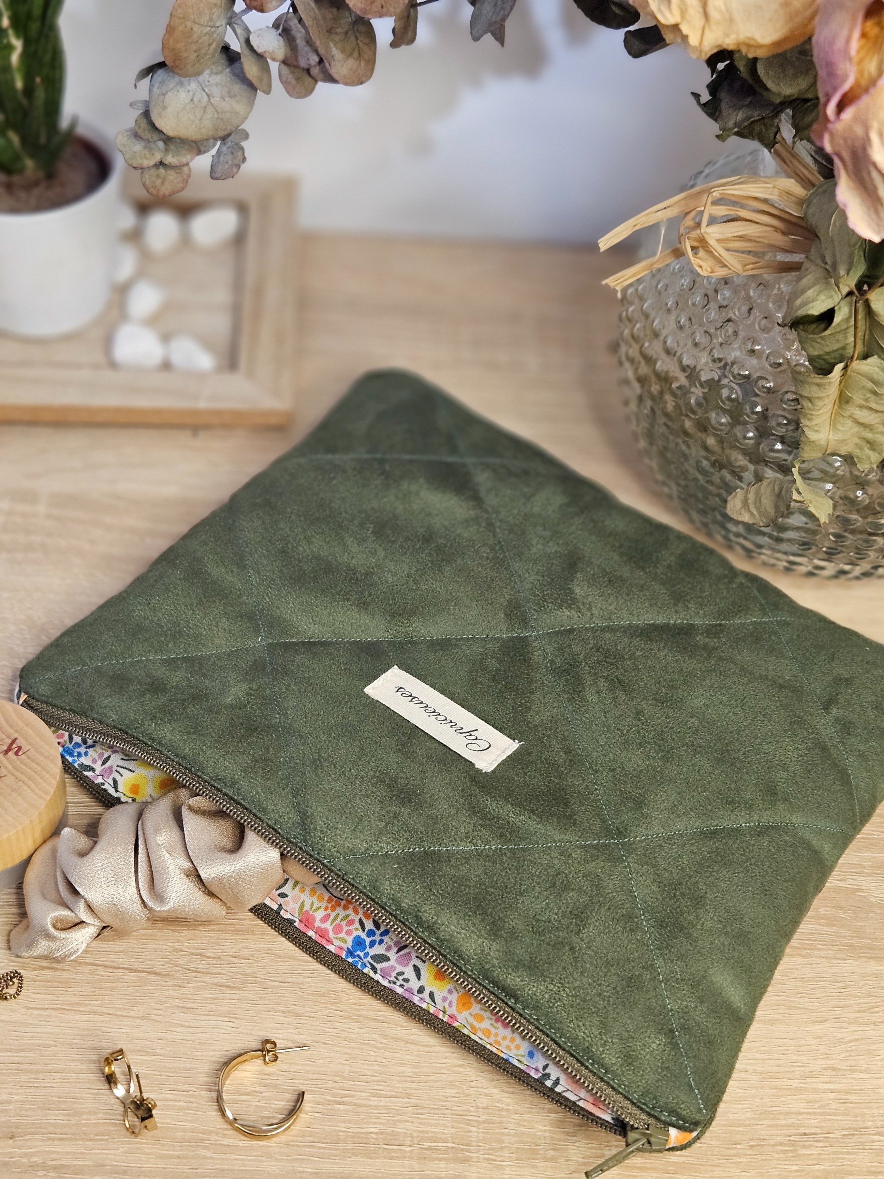 Pochette plate molletonnée, suédine verte, doublure fleurie