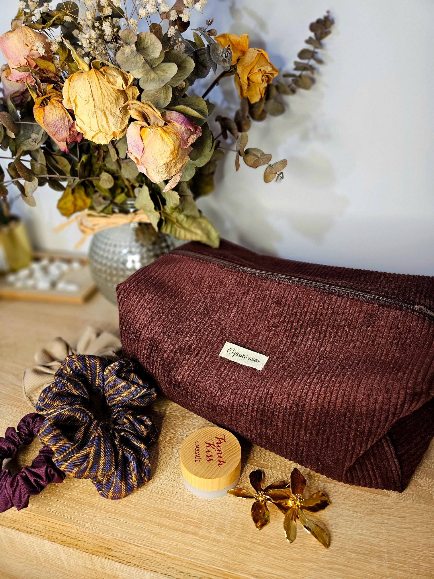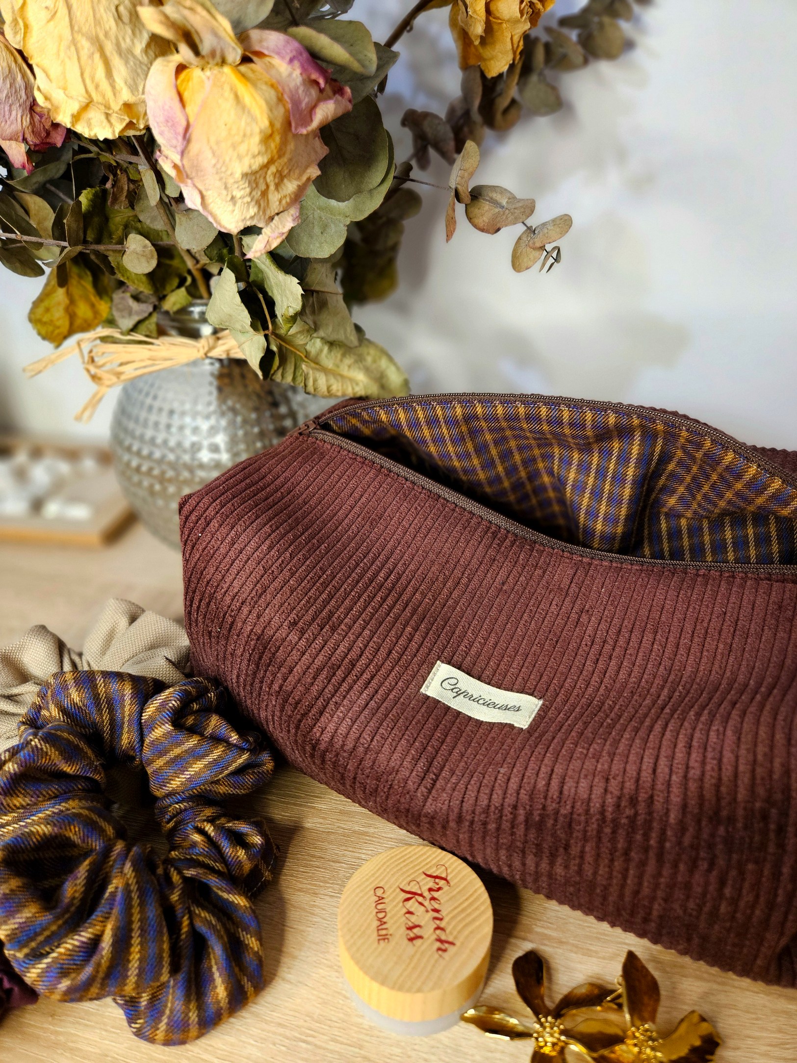 Trousse de voyage velours côtelé bordeaux, doublure carreaux