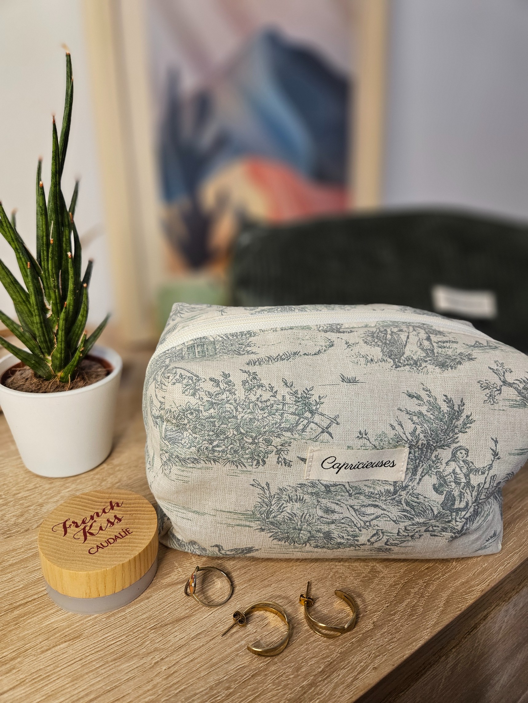 Trousse à maquillage motif vert toile de Jouy, doublure beige