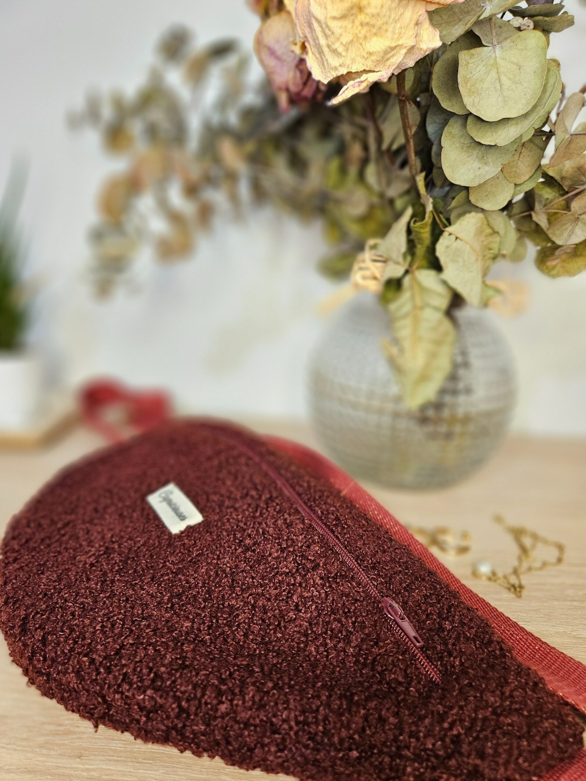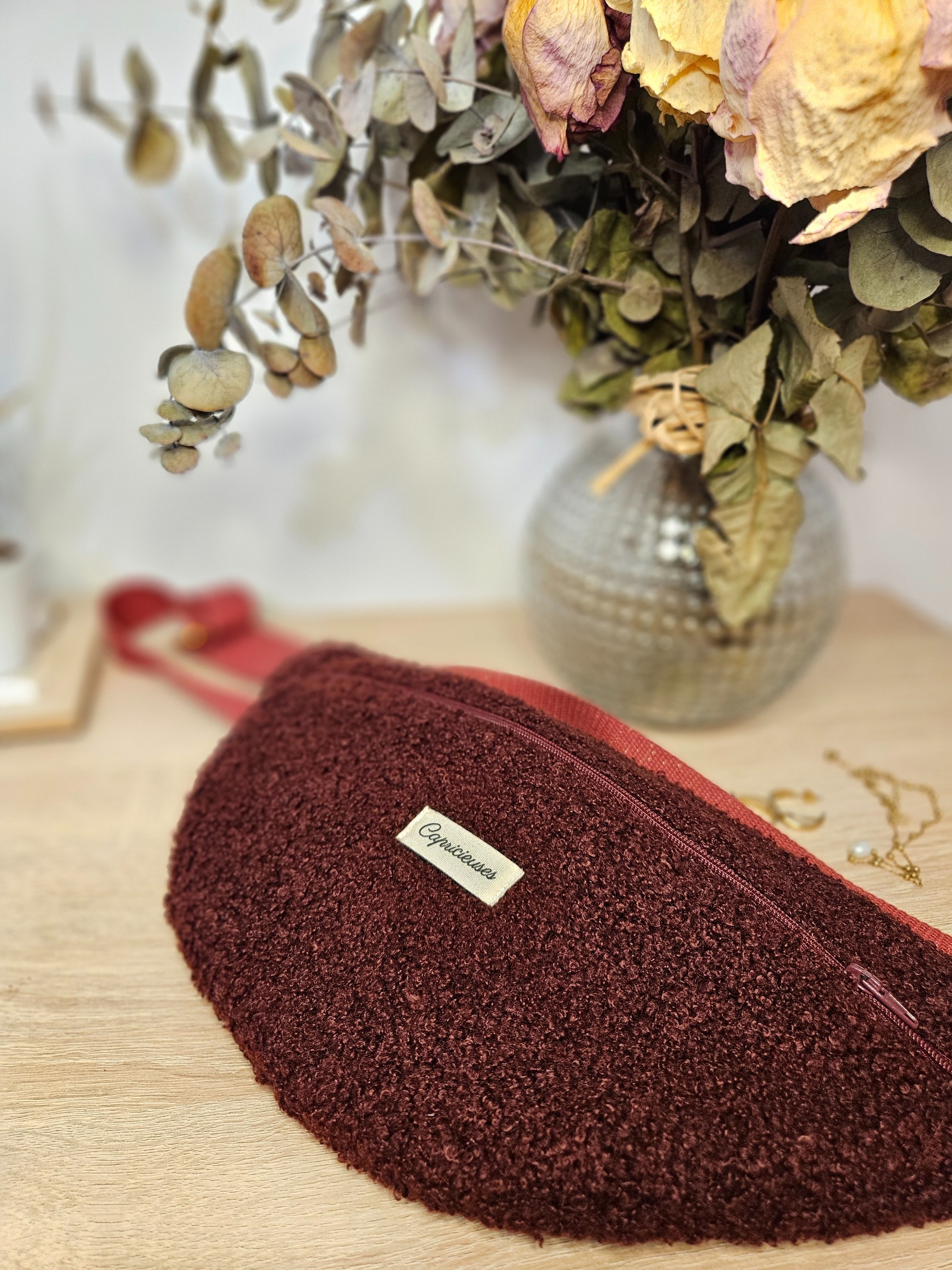 Sac banane tissu bouclette bordeaux, doublure fleurie