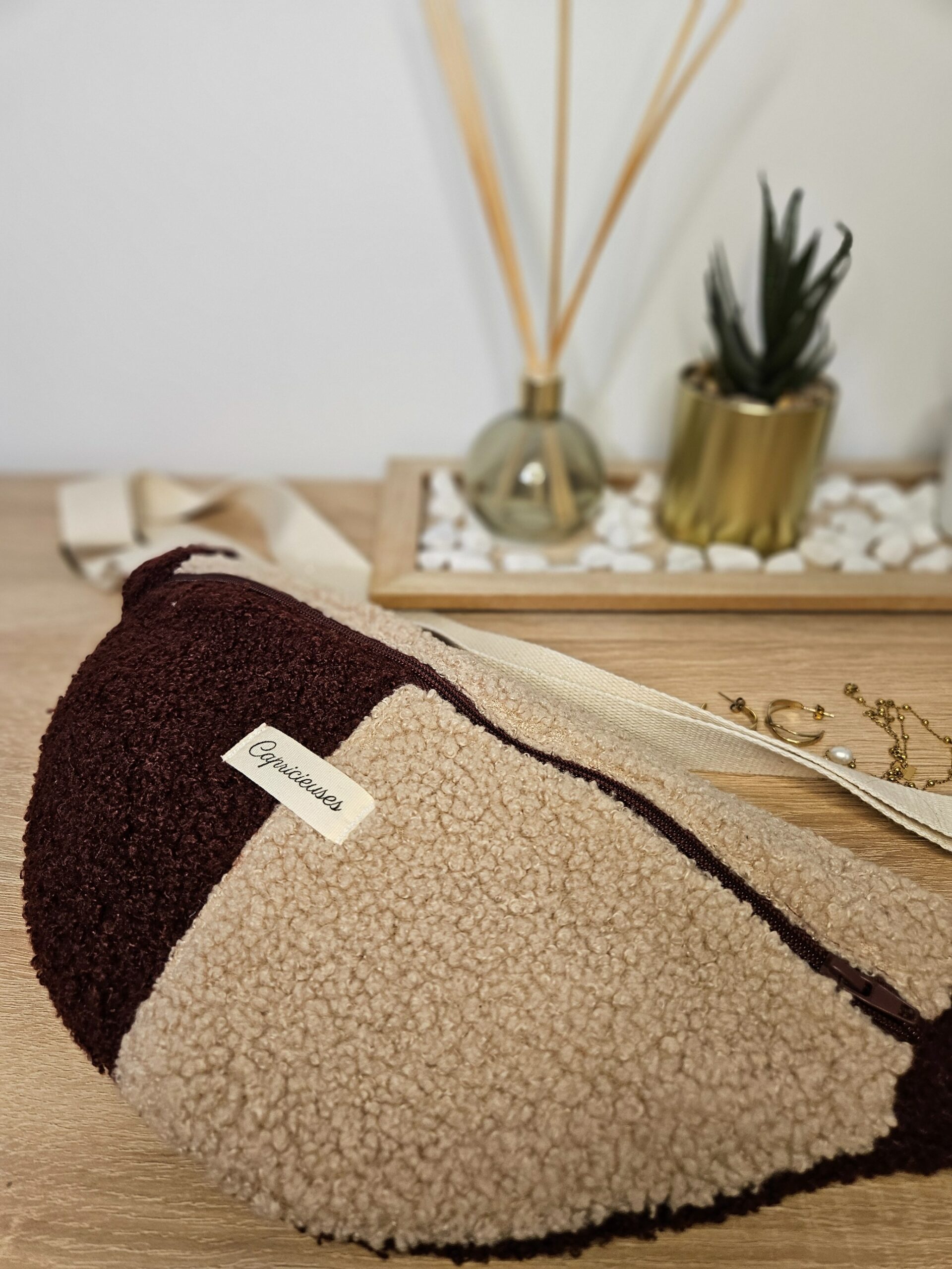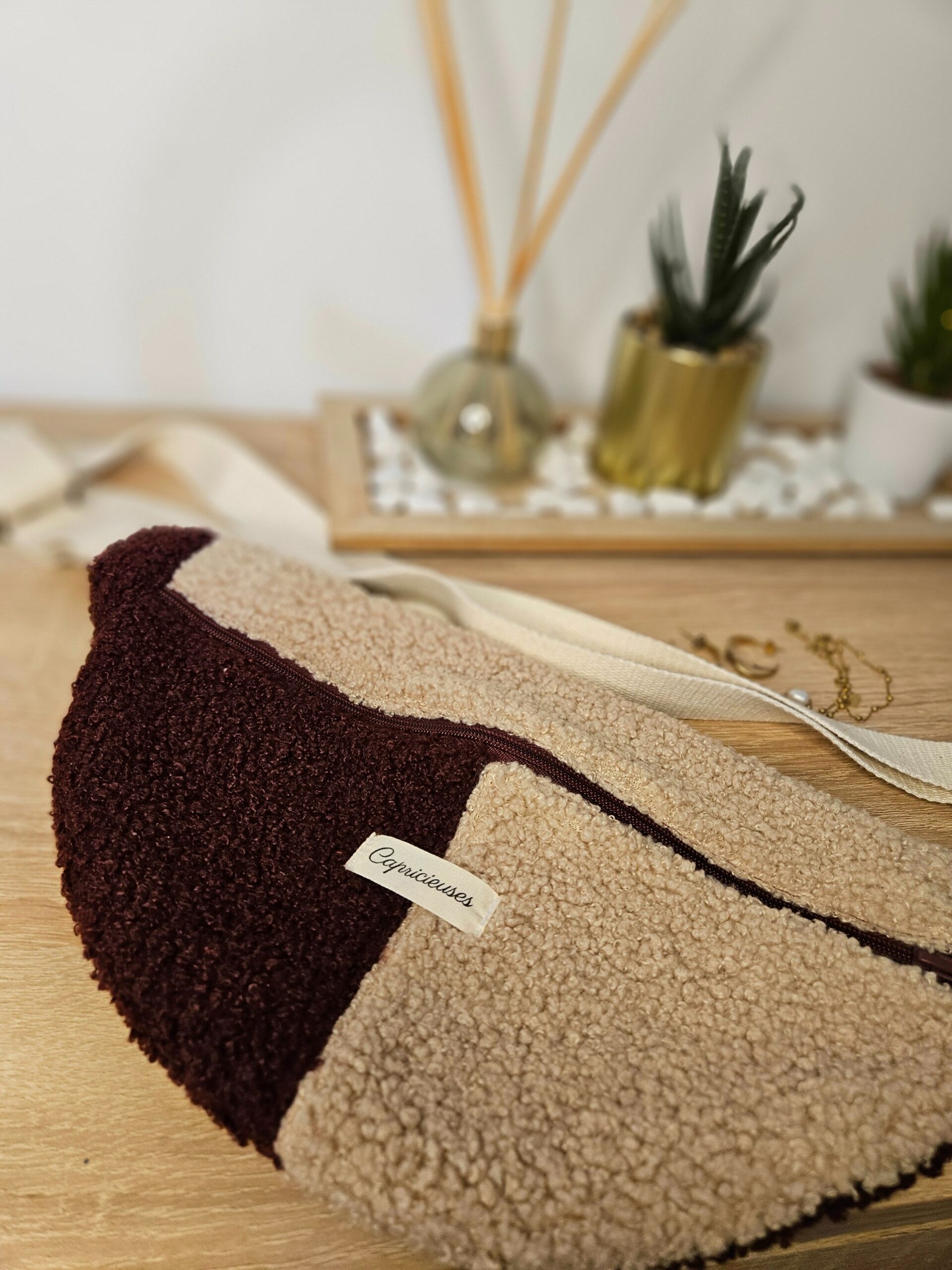 Sac banane découpe tissus bouclette beige et bordeaux, doublure bordeaux